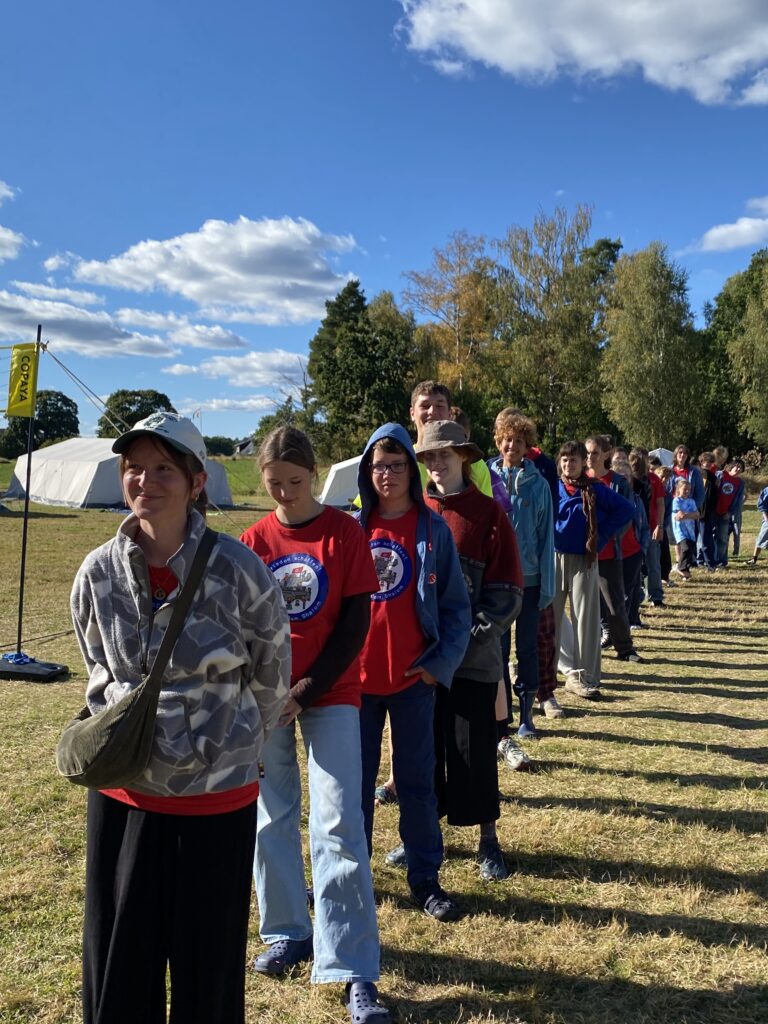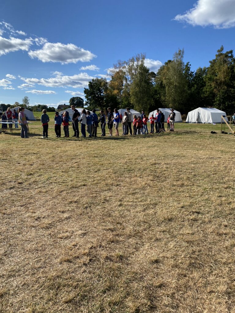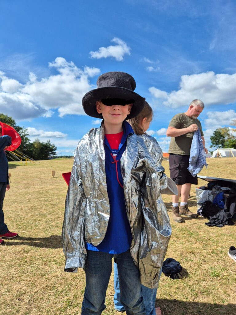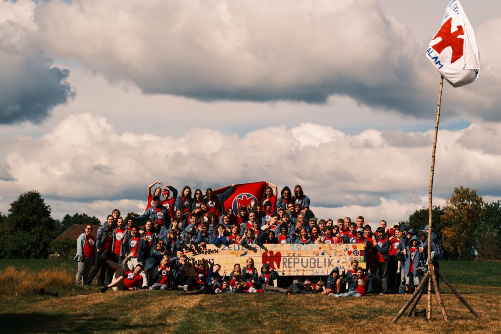 Vor dem Foto gab es noch eine kleine „Bescherung“: Alle haben ihr nagelneues Zeltlager-2025-Falken-T-Shirt bekommen – und natürlich wollten wir die gleich auch stolz präsentieren. Was wäre besser geeignet als ein großes Gruppenfoto? Ein riesiges Danke geht an Kalle, der sich nicht scheute, den 10‑Sekunden‑Spurt vom Selbstauslöser bis in die Mitte der Gruppe hinzulegen – und es rechtzeitig geschafft hat. Ohne diese sportliche Meisterleistung wäre das Bild nur halb so komplett gewesen.