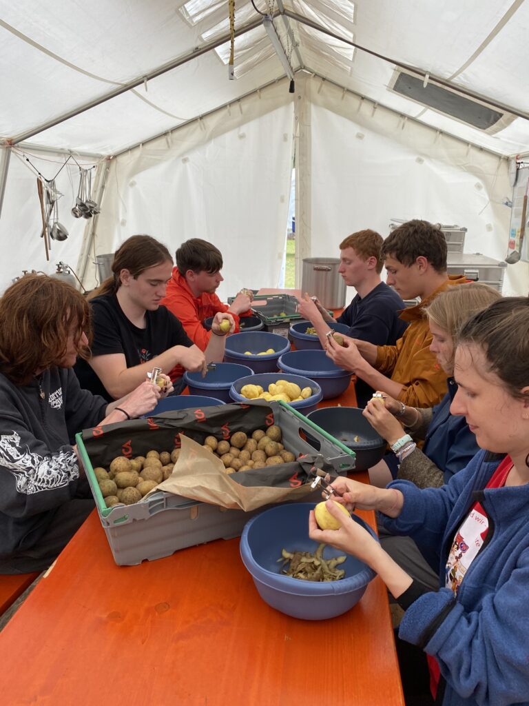 Nach dem Mittagessen haben die Kulturgruppen weiter an ihren Beiträgen geplant. Eigentlich sollte heute Abend das große Kulturfest stattfinden, aber wegen des Dauerregens haben wir beschlossen, es auf morgen zu verschieben. Da soll das Wetter besser werden – was uns sehr hilft, denn wir müssen auch bald mit dem Zeltabbau beginnen. Nasse Zelte einzupacken und später in Berlin wieder auszubreiten und zu trocknen, bedeutet eine Menge zusätzlicher Arbeit. Umso wichtiger ist es, jede trockene Minute der kommenden Tage zu nutzen.
