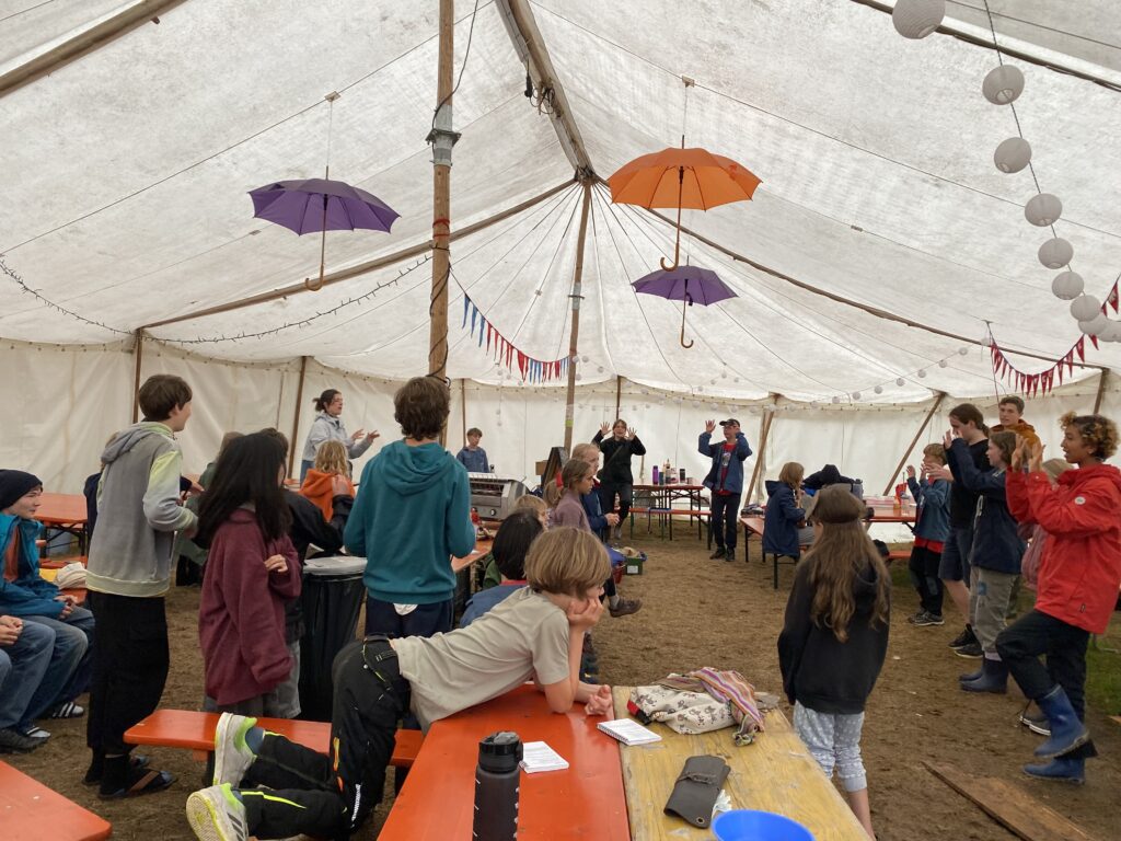 Zum Abschluss des Tages gibt es ein Lesecafé. In verschiedenen Zelten machen wir es uns gemütlich, lesen und lassen uns Geschichten vortragen – unter anderem aus „ Vom Faustkeil zur Fabrik“, „Krücke“ und andere Bücher, die sich die Kinder gewünscht haben. Dazu gibt’s Wärmflaschen für alle, auch wenn es gar nicht so kalt ist, und dann kehrt langsam Nachtruhe ein.
