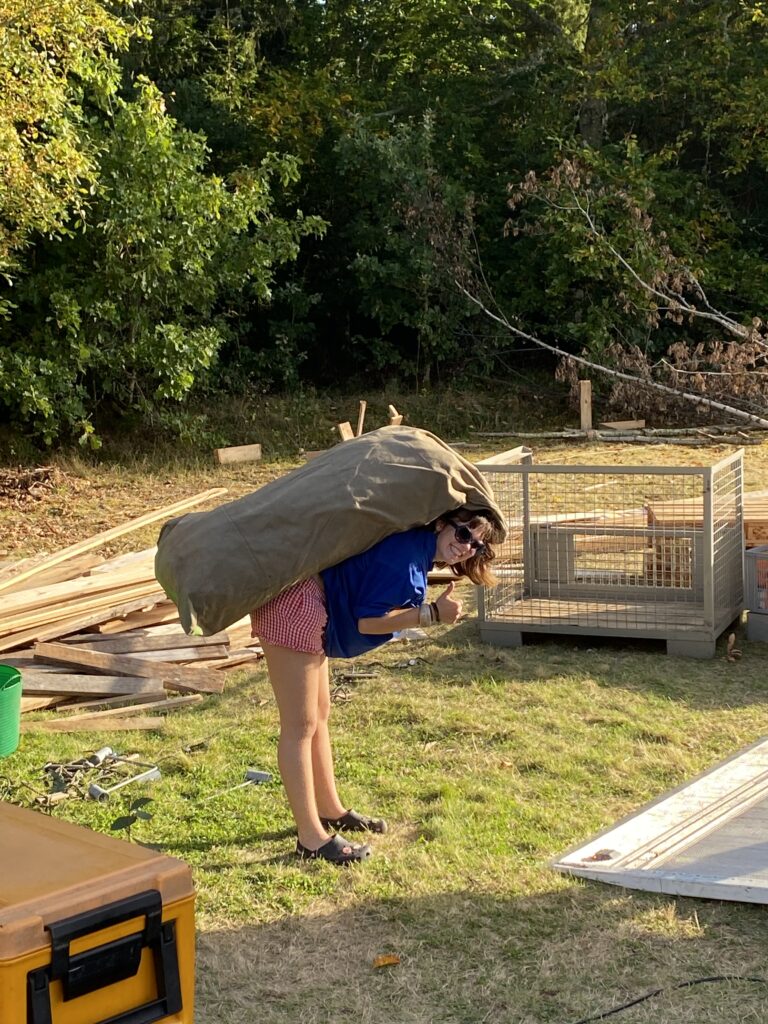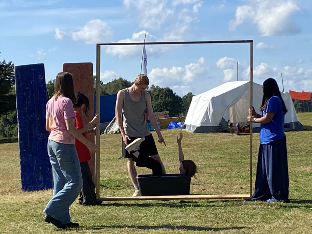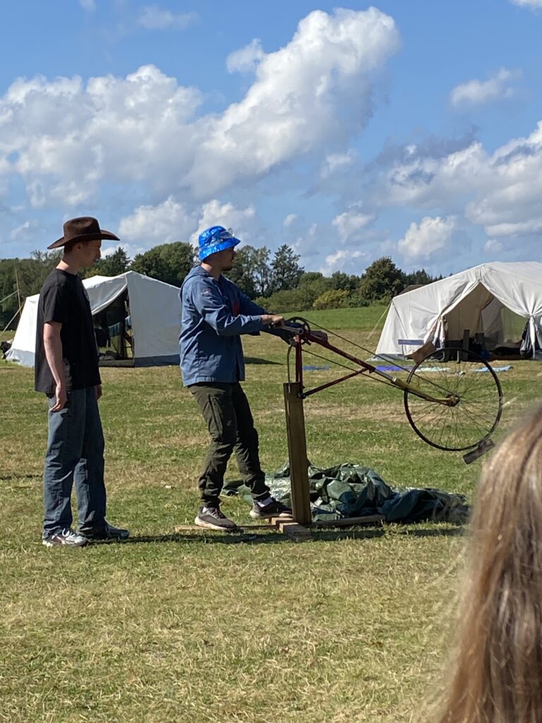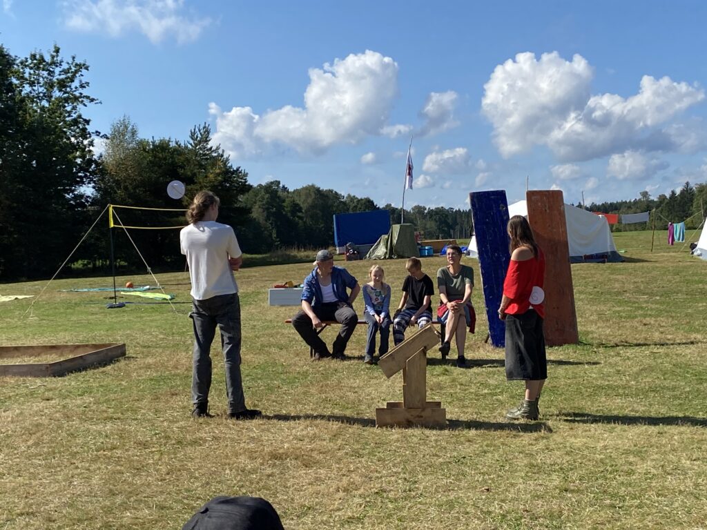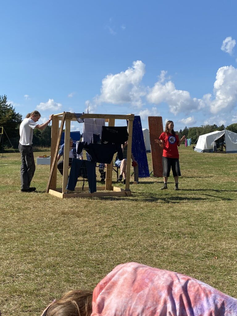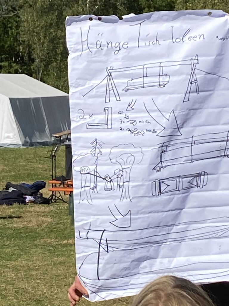 Sehr geheimnisvoll ging es anschließend bei den „Geheimwerkeln“ zu. Dabei wurden Konstruktionen und Maschinen vorgestellt, die aus alten Materialien zusammengebaut worden waren: Darunter eine (noch unfertige, aber beeindruckende!) Maschine, die Zelt-Heringe automatisch in den Boden klopfen kann, sowie eine Toaster-Konstruktion, die unser Frühstück in Zukunft noch schneller gelingen lassen würde. Aber auch die Geschirrrutsche kam unter den Hammer. Kreativität pur!